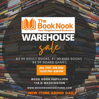 Book Nook Papillion will have its warehouse sale from Friday, January 31st through February 2nd. Doors will open each day from 12 PM - 4 PM.